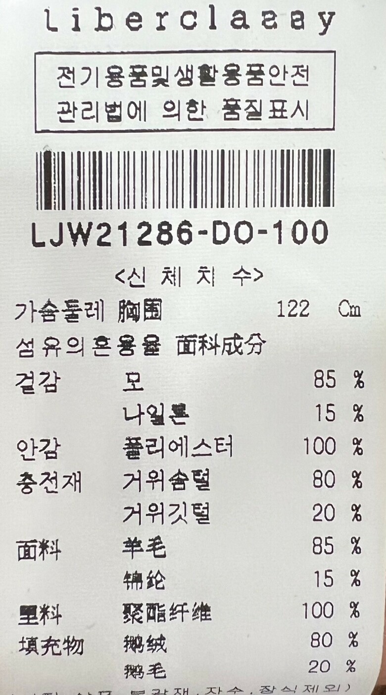 | 1. 제품 소재 (섬유의 조성 또는 혼용률을 백분율로 표시, 기능성인 경우 성적서 또는 허가서) | 겉감:모 85%, 나일론 15% / 안감:폴리에스테르 100% |