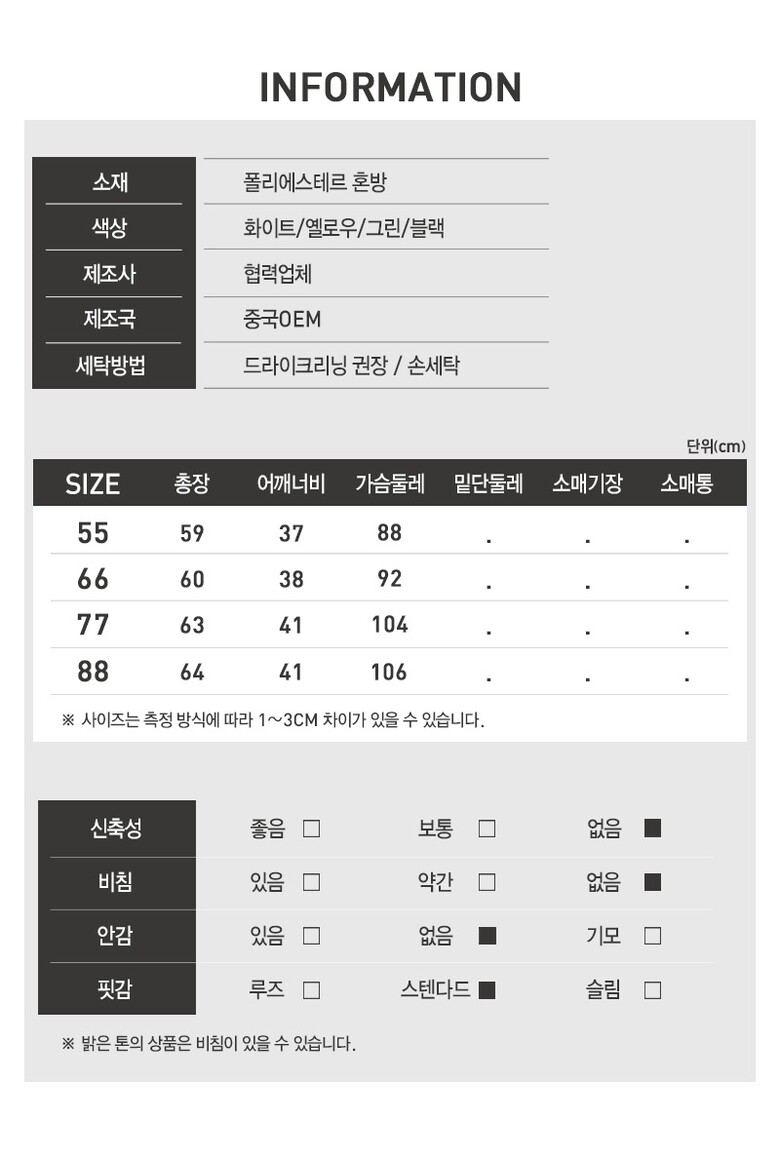 1. 제품 소재 (섬유의 조성 또는 혼용률을 백분율로 표시, 기능성인 경우 성적서 또는 허가서) | 상세페이지참고 |