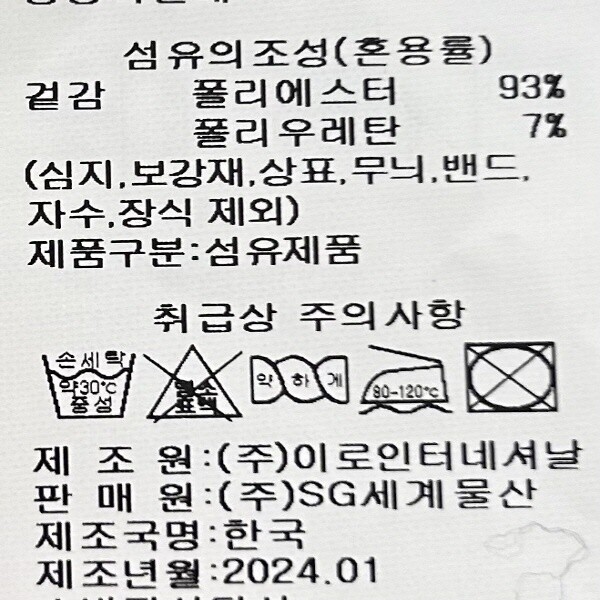 | 1. 제품 소재 (섬유의 조성 또는 혼용률을 백분율로 표시, 기능성인 경우 성적서 또는 허가서) | 겉감-폴리에스터93% 폴리우레탄7% |