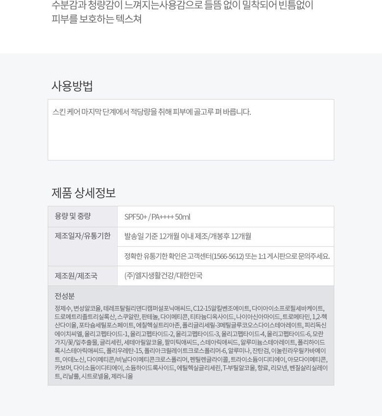 7. 주요성분 | 정제수, 변성알코올, 테레프탈릴리덴디캠퍼설포닉애씨드, C12-15알킬벤조에이트, 다이아이소프로필세바케이트,