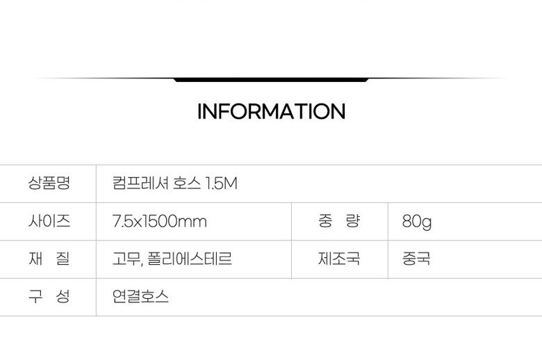 해당 상품은 여러가지 구성이 있으니 구매를 원하시는 구성의 상품명과 상세페이지의 내용이 일치하는지 확인 후 구매 부탁드립니다. 해당 상품은 [ 컴프레셔 호스 1.5M ] 구성의 상품입니다.