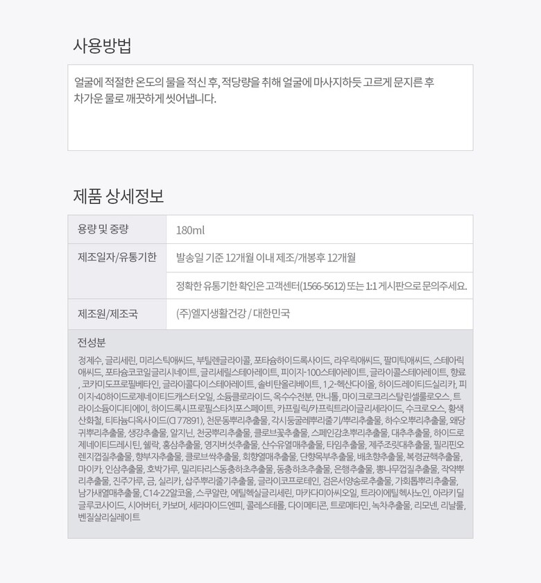 | 9. 사용 시 주의사항 | 1. 화장품을 사용 중 붉은 반점, 부어오름, 가려움증, 자극 등의 이상이 있는 경우, 적용 부위가 직사광선에 의하여 이상이 생긴 경우 사용을 중지하시고 피부과 전문의와 상담하세요. 2. 상처가 있는 부위, 습진 및 피부트러블 등의 이상이 있는 부위에는 사용하지 마세요. 3. 보관 및 취급시 주의사항 가)사용 후에는 반드시 마개를 닫아두세요. 나)유아ㆍ소아의 손이 닿지 않는 곳에 보관하세요. 다)고온 다습한 곳 및 직사광선 닿는 장소는 피해주세요. |