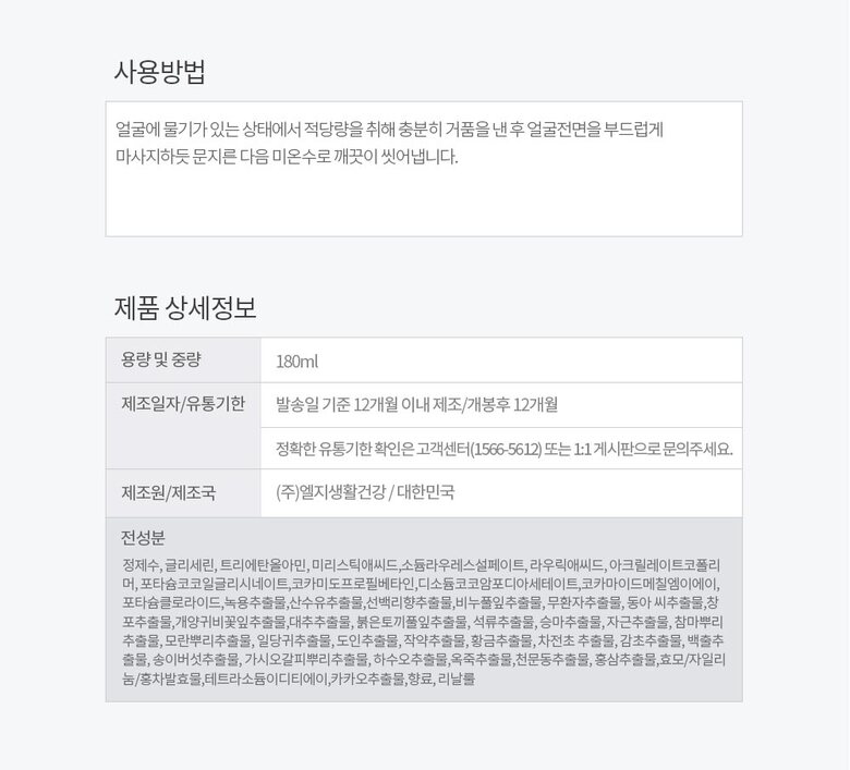 | 9. 사용 시 주의사항 | 1. 화장품을 사용 중 붉은 반점, 부어오름, 가려움증, 자극 등의 이상이 있는 경우, 적용 부위가 직사광선에 의하여 이상이 생긴 경우 사용을 중지하시고 피부과 전문의와 상담하세요. 2. 상처가 있는 부위, 습진 및 피부트러블 등의 이상이 있는 부위에는 사용하지 마세요. 3. 보관 및 취급시 주의사항 가)사용 후에는 반드시 마개를 닫아두세요. 나)유아ㆍ소아의 손이 닿지 않는 곳에 보관하세요. 다)고온 다습한 곳 및 직사광선 닿는 장소는 피해주세요. |