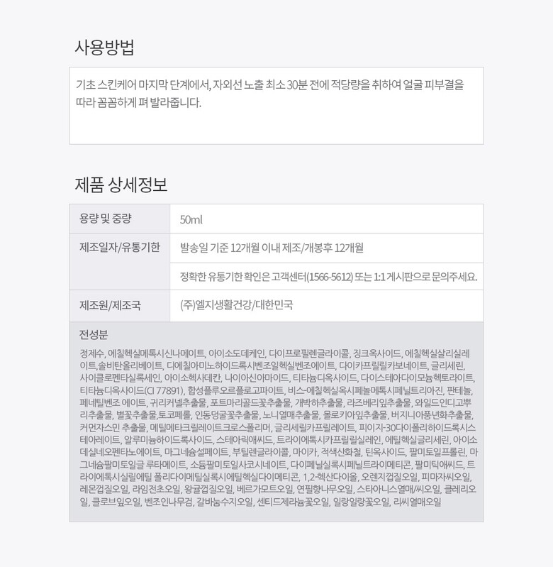 | 4. 사용방법 | 기초 스킨케어 마지막 단계에서 자외선 노출 최소 30분전에 적당량을 덜어 피부결을 따라 꼼꼼하게 펴 발라줍니다, |