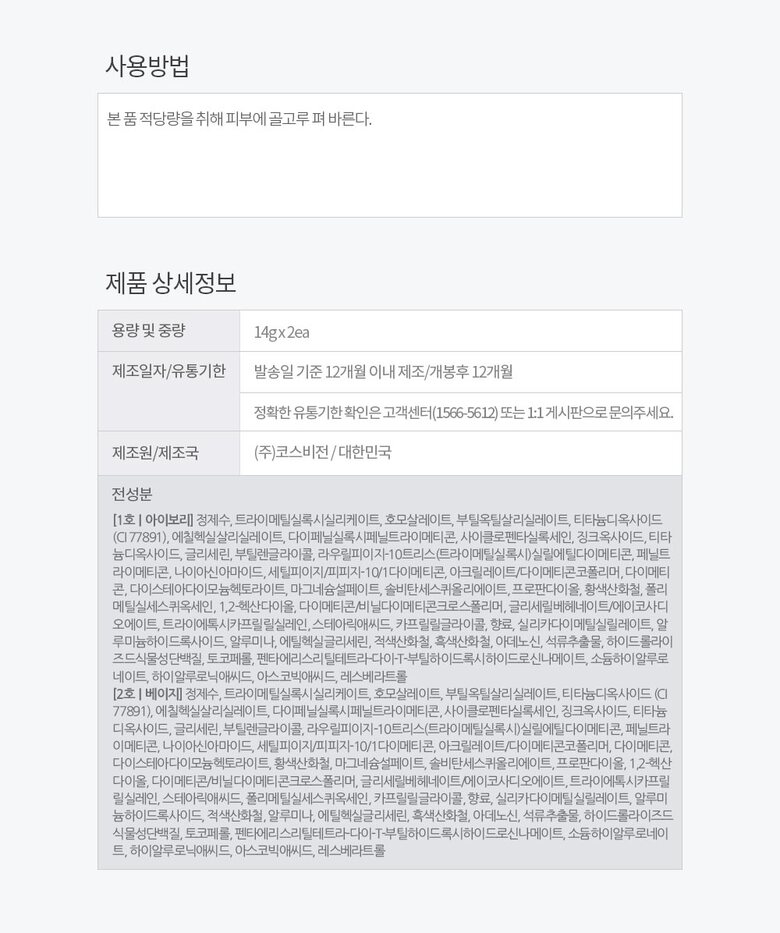 | 9. 사용 시 주의사항 | 1. 화장품을 사용 중 붉은 반점, 부어오름, 가려움증, 자극 등의 이상이 있는 경우, 적용 부위가 직사광선에 의하여 이상이 생긴 경우 사용을 중지하시고 피부과 전문의와 상담하세요. 2. 상처가 있는 부위, 습진 및 피부염 등의 이상이 있는 부위에는 사용하지 마세요. 64. 보관 및 취급시 주의사항 가)사용 후에는 반드시 마개를 닫아두세요. 나)유아ㆍ소아의 손이 닿지 않는 곳에 보관하세요. 다)고온 다습한 곳 및 직사광선 닿는 장소는 피해주세요. |