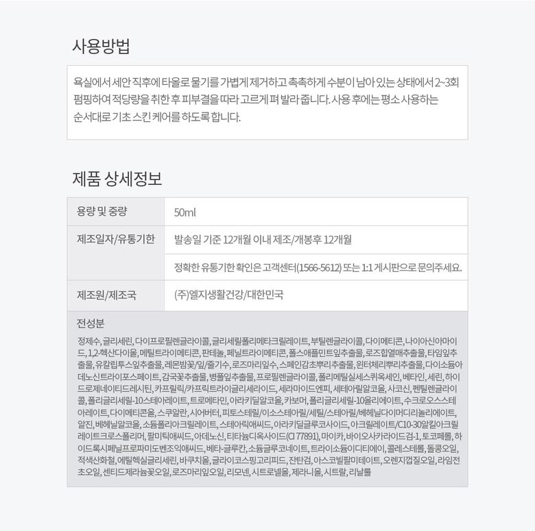 | 4. 사용방법 | 토너 사용 후 2~3회 펌핑하여 적당량을 취한 뒤 피부결을 따라 부드럽게 펴 바른 후, 손바닥의 체온 으로 얼굴을 가볍게 감싸며 흡수시켜 줍니다. |