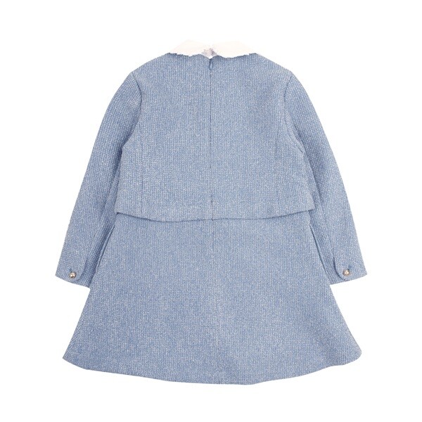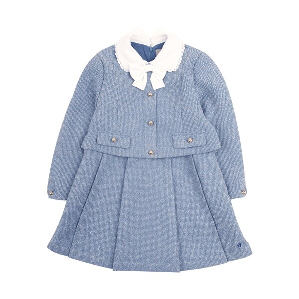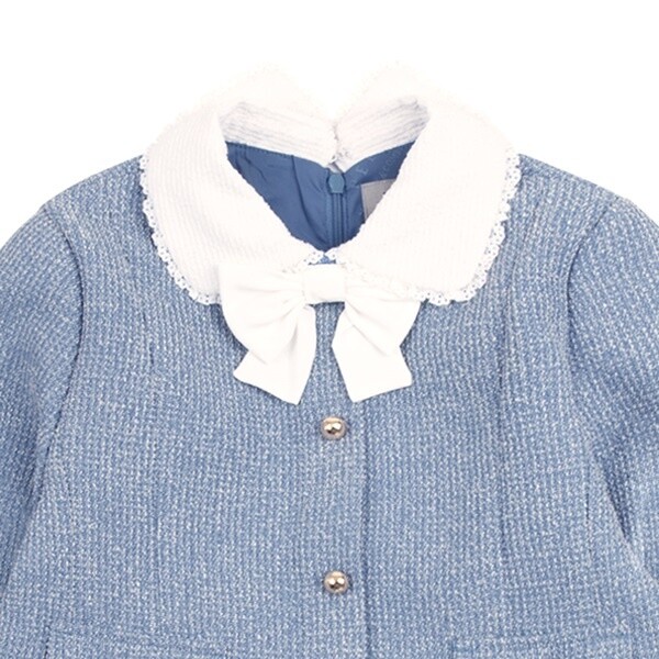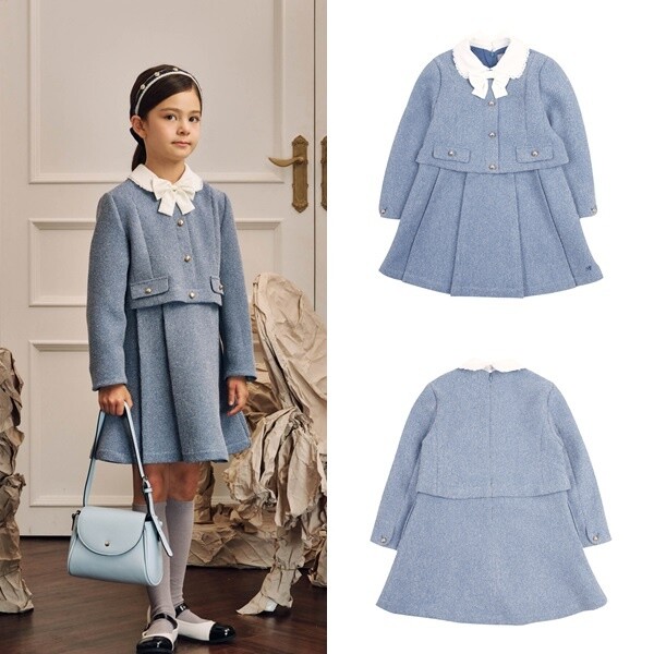 고급스러운 블루 컬러의 트위드 소재가 돋보이는 원피스 아이템입니다. 자켓과 스커트를 함께 연출한 듯한 셋업 디자인의 아이템으로 하나만으로도 룩에 고급스러운 분위기를 완성해주는 아이템입니다.화사하게 배색된 아이보리 컬러의 카라와 탈부착 리본이 포인트가 되어 사랑스러운 여아의 무드를 더해 주는 아이템입니다. 네이비 퀼팅 코트와 함께 고급스러운 타운 스타일링을 제안할 수 있습니다.