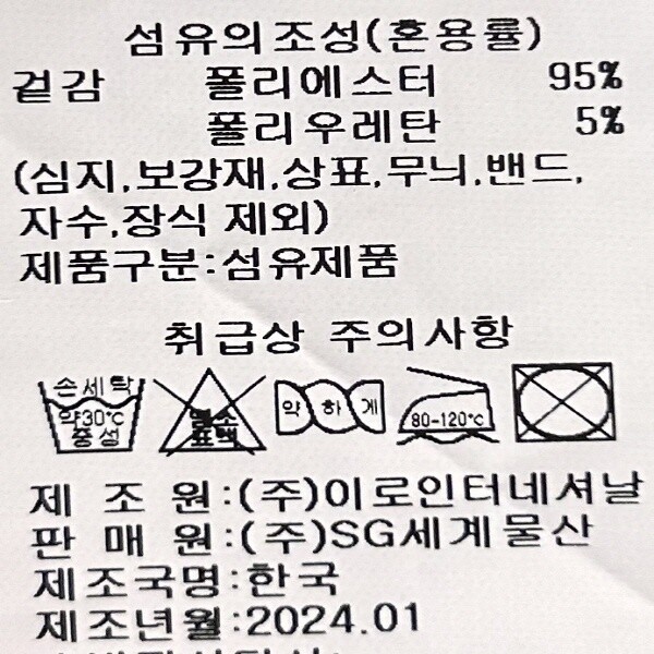 | 1. 제품 소재 (섬유의 조성 또는 혼용률을 백분율로 표시, 기능성인 경우 성적서 또는 허가서) | 겉감-폴리에스터95% 폴리우레탄5% |