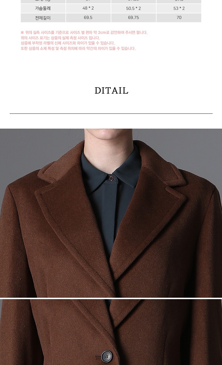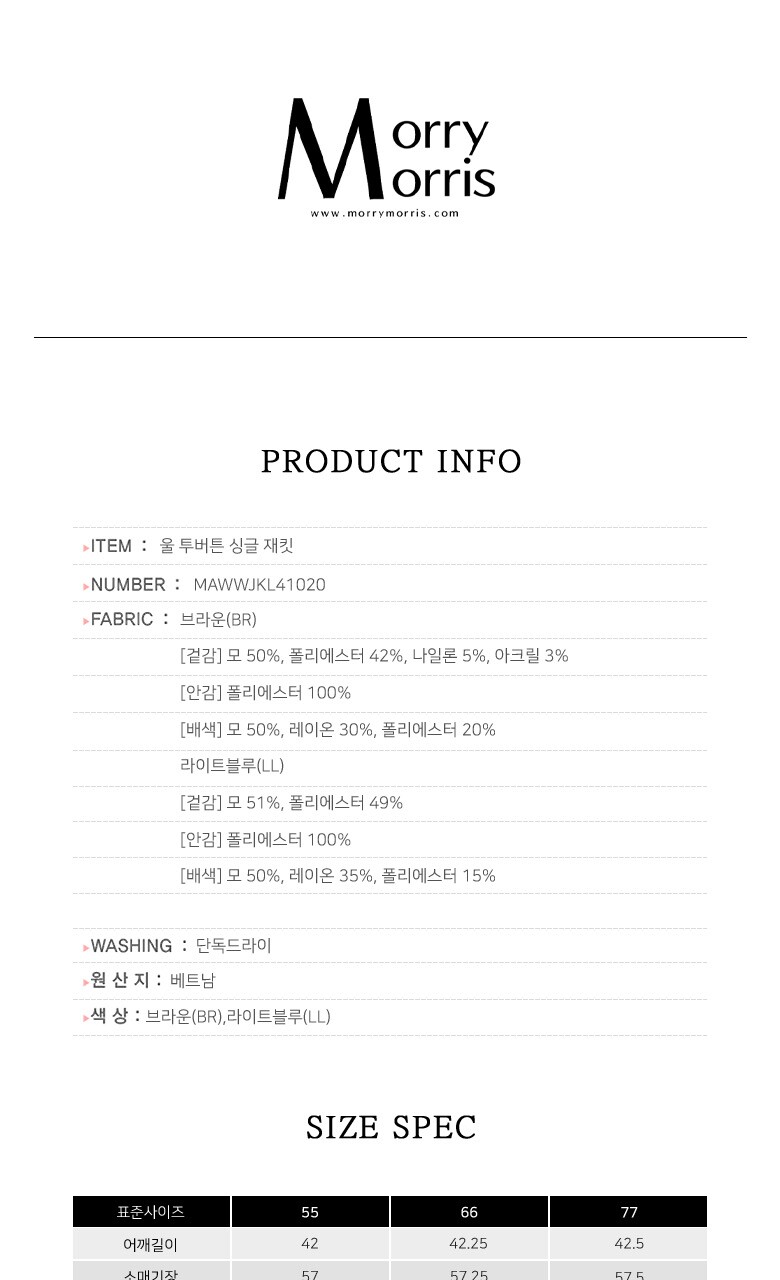 1. 제품 소재 (섬유의 조성 또는 혼용률을 백분율로 표시, 기능성인 경우 성적서 또는 허가서) | -브라운(BR) [겉감] 모 50%, 폴리에스터 42%, 나일론 5%, 아크릴 3% [안감] 폴리에스터 100% [배색] 모 50%, 레이온 30%, 폴리에스터 20% -라이트블루(LL) [겉감] 모 51%, 폴리에스터 49% [안감] 폴리에스터 100% [배색] 모 50%, 레이온 35%, 폴리에스터 15% |