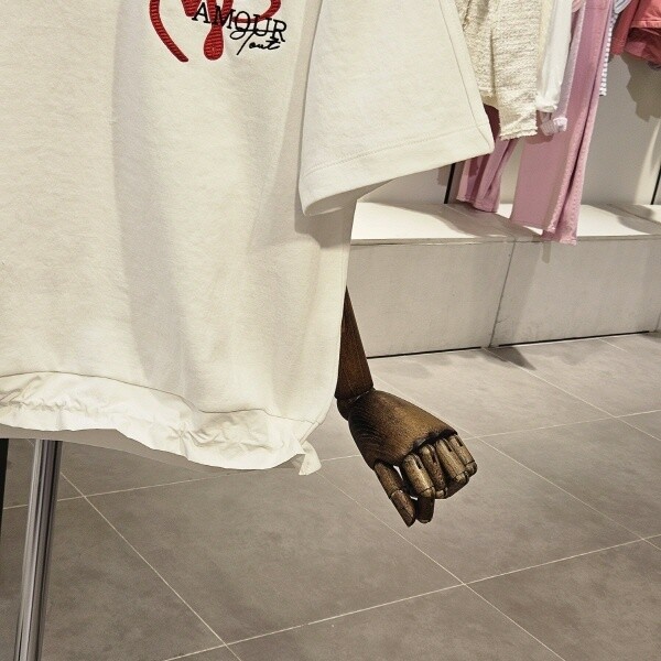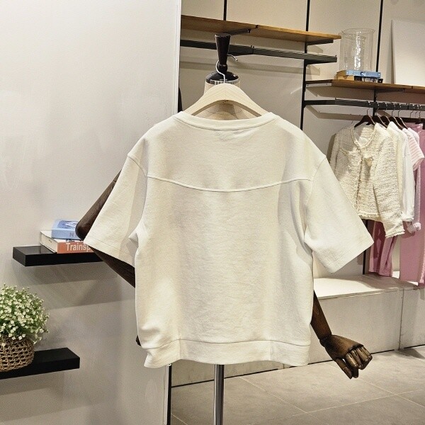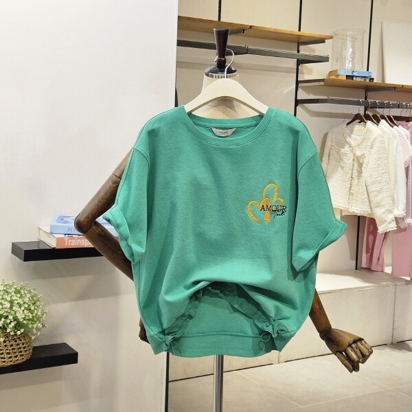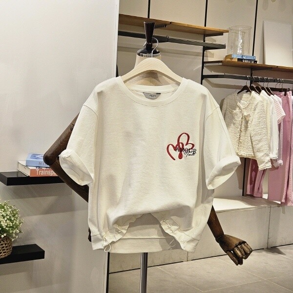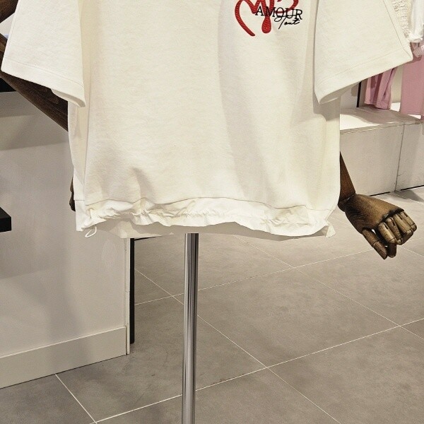 전체적으로 여유있는 핏감의하트자수 스트링 라운드 티셔츠 입니다