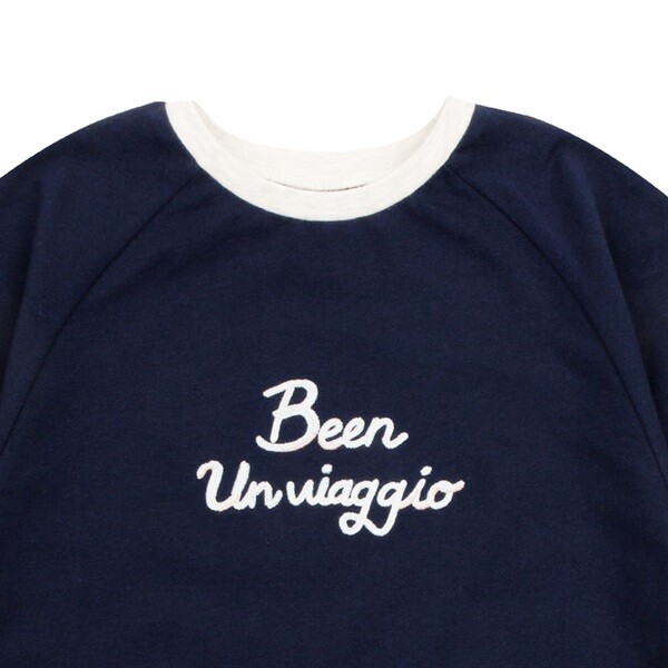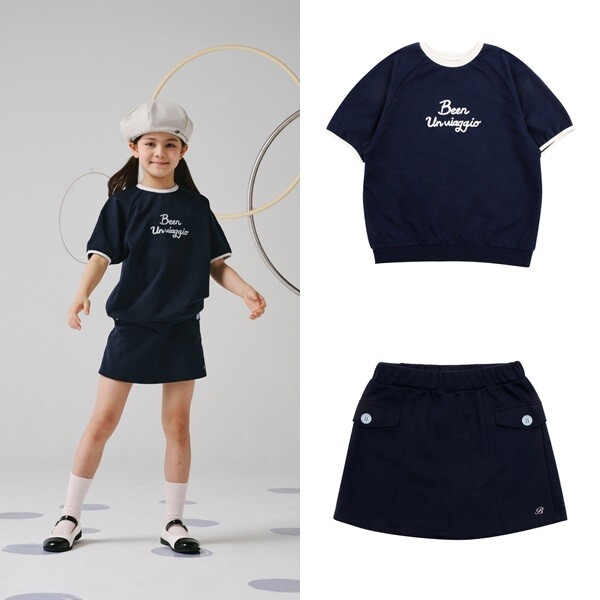 빈의 프렌치한 감성과 여아의 사랑스러운 무드가물씬 느껴지는 티셔츠와멋스러운 후다 장식과 화사한 스카이블루 컬러의 단추가포인트가 되는 스커트팬츠의 셋업입니다.