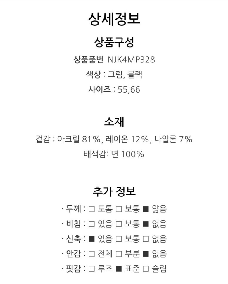 | 1. 제품 소재 (섬유의 조성 또는 혼용률을 백분율로 표시, 기능성인 경우 성적서 또는 허가서) | 상품상세참조 |