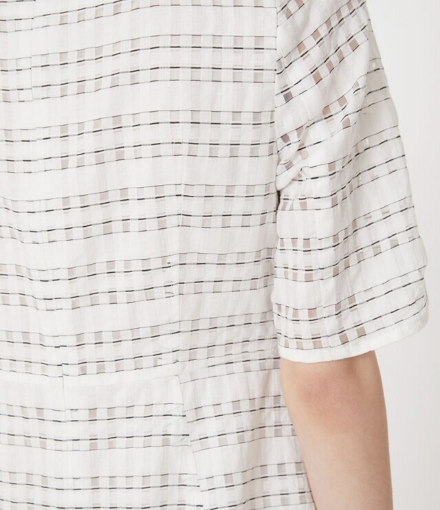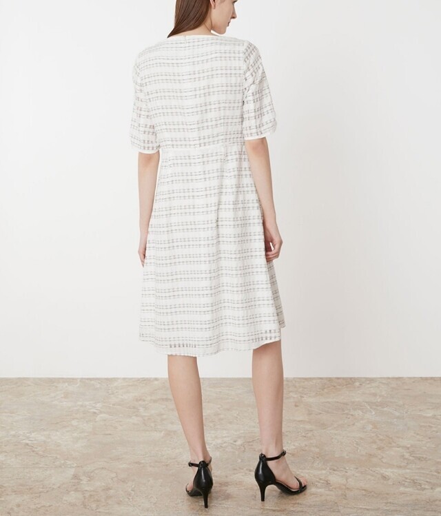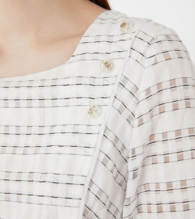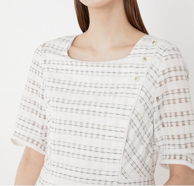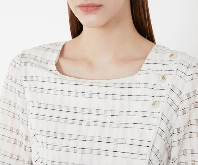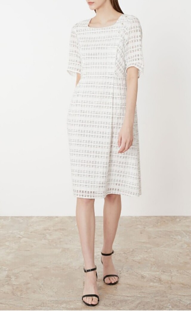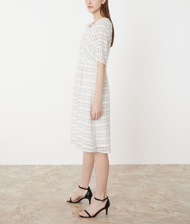 우아한 실루엣의 플레어 원피스로 여성스러움이 돋보이며 한쪽 어깨선에 금속 단추로 포인트를 주어 세련