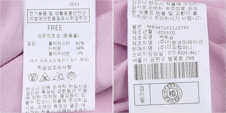 | 1. 제품 소재 (섬유의 조성 또는 혼용률을 백분율로 표시, 기능성인 경우 성적서 또는 허가서) | 겉감:폴리에스터62% 폴리우레탄4% 레이온34% |