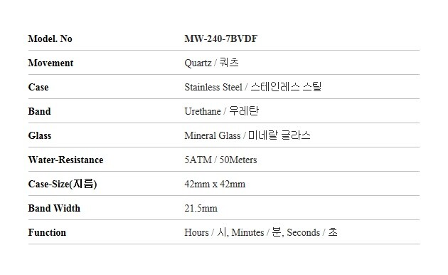 | 7. 주요 사양 | 스테인리스스틸 시계 쿼츠 |