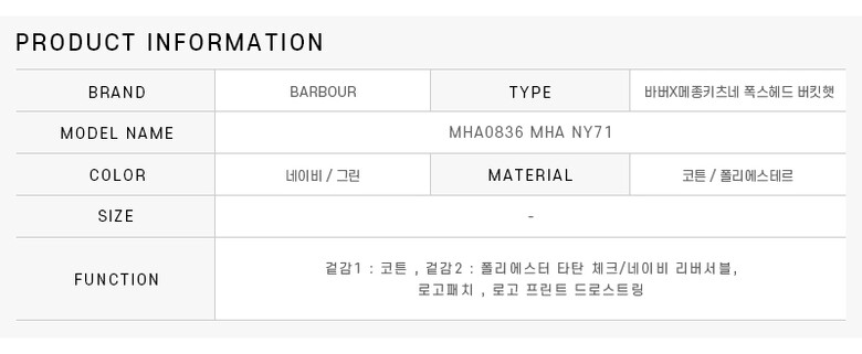 바버 BARBOURMHA0836 MHA NY71 바버x메종키츠네 공용 버킷햇