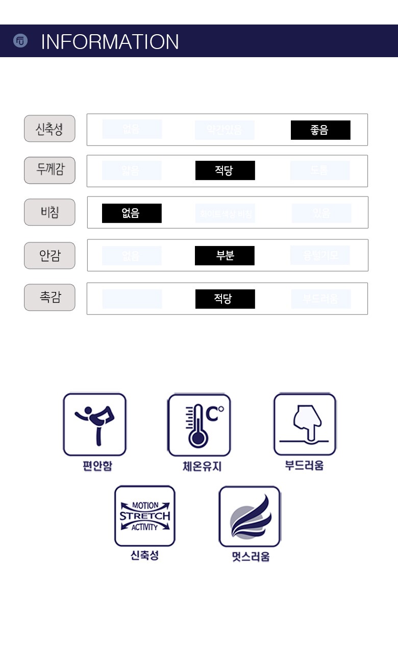 | 1. 제품 소재 (섬유의 조성 또는 혼용률을 백분율로 표시, 기능성인 경우 성적서 또는 허가서) | 상세설명참고 |