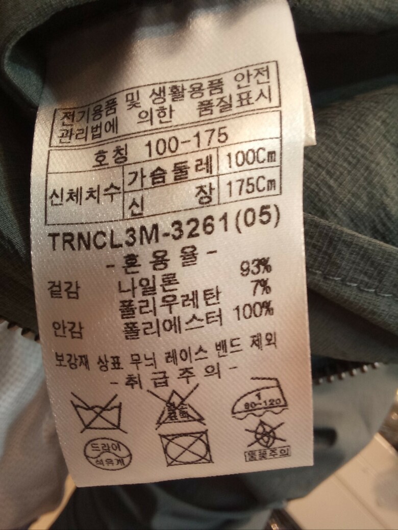 | 1. 제품 소재 (섬유의 조성 또는 혼용률을 백분율로 표시, 기능성인 경우 성적서 또는 허가서) | 겉감:나일론 93% / 안감:폴리우레탄 7% |