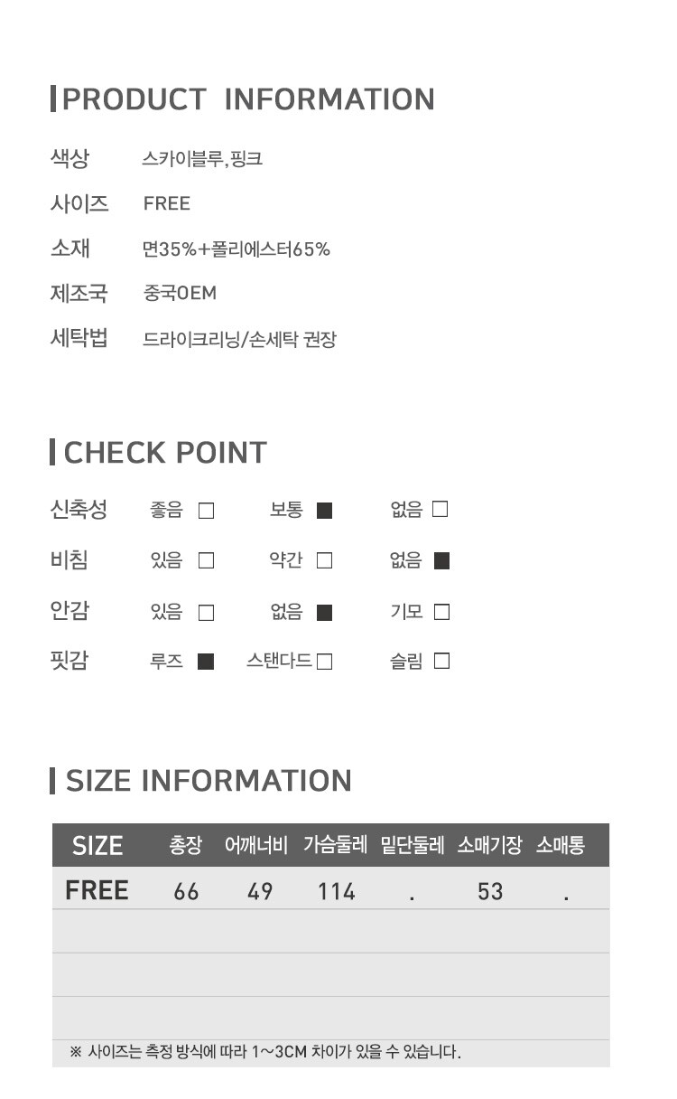 | 1. 제품 소재 (섬유의 조성 또는 혼용률을 백분율로 표시, 기능성인 경우 성적서 또는 허가서) | 상세페이지참고 |