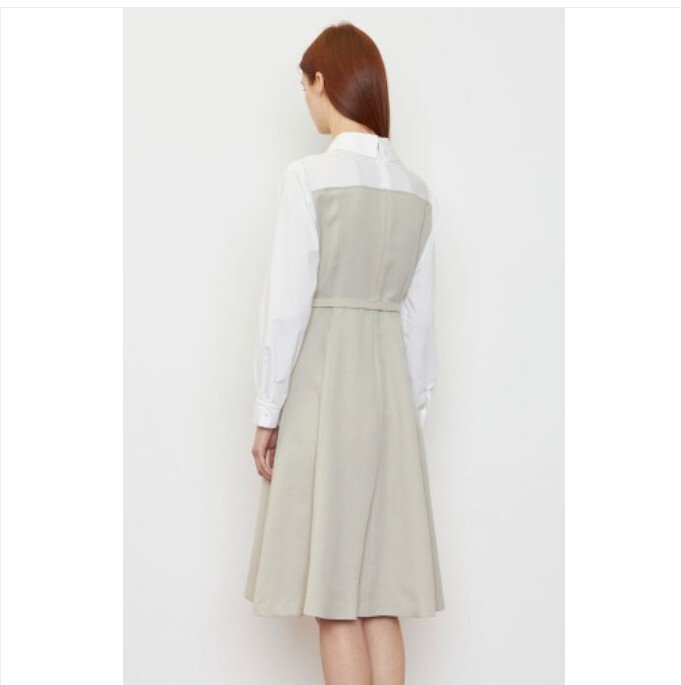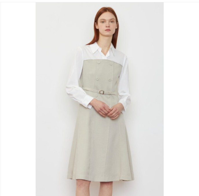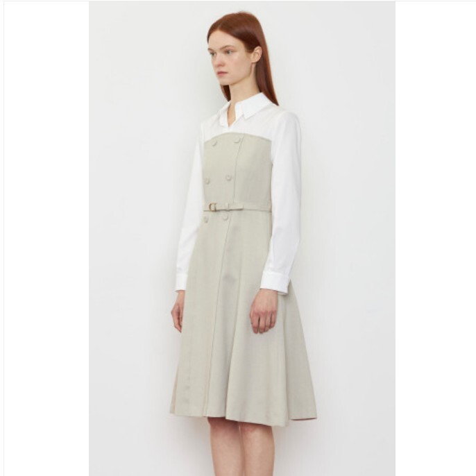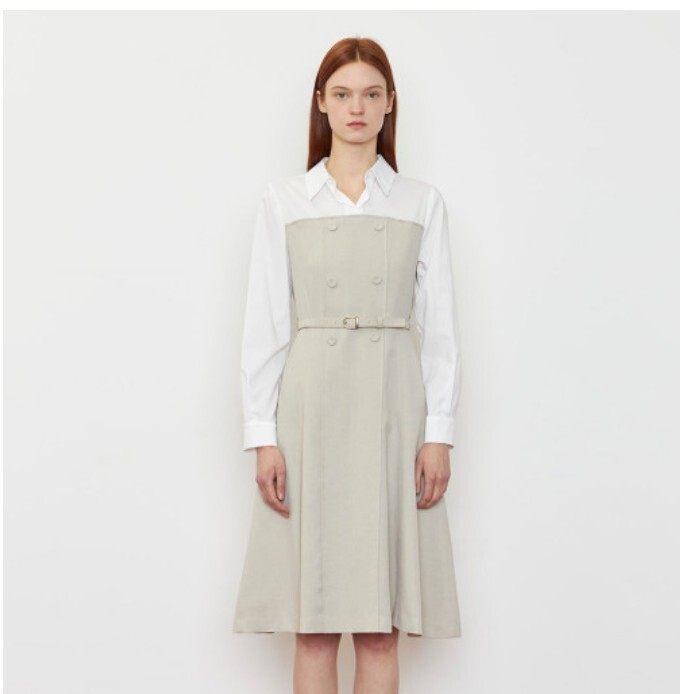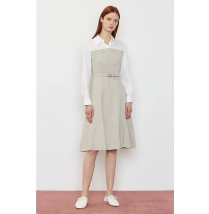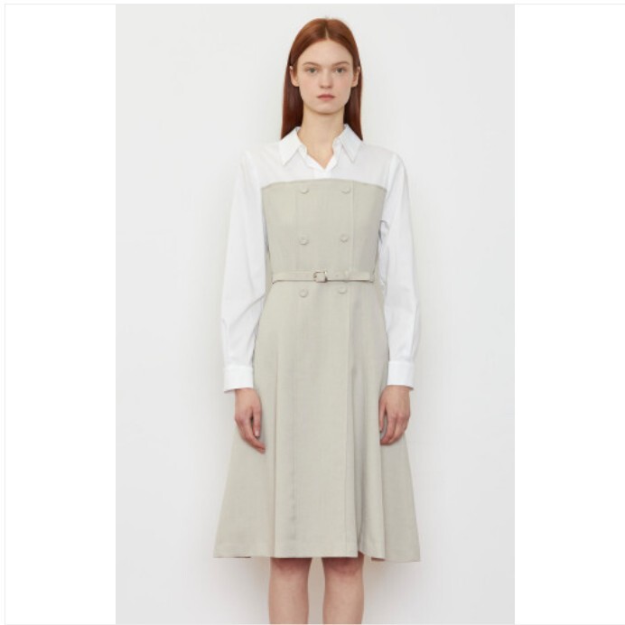 배색 소재와 더블버튼 트렌치 디자인을 접합하여 클래식하면서 페미닌한 무드가 매력적인 원피스입니다.