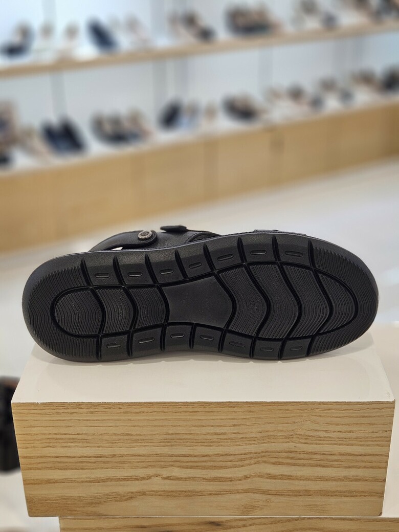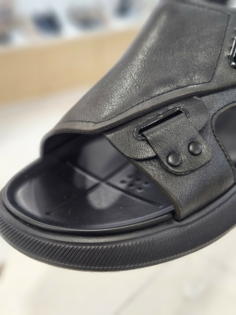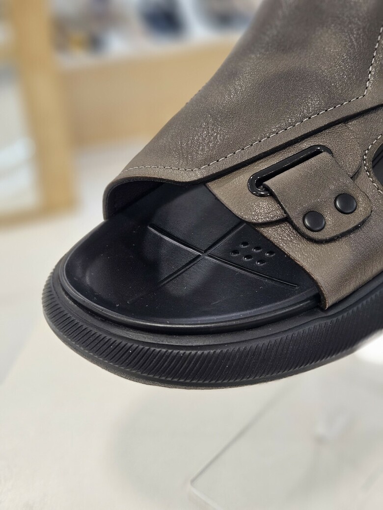 부드러운 워싱이 들어간 가죽으로 옆 장식 포인트의 준 샌들