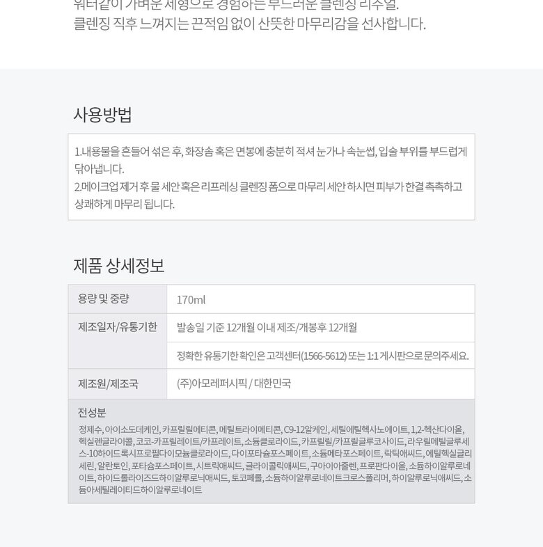 닦아냅니다. 2.메이크업 제거 후 물 세안 혹은 리프레싱 클렌징 폼으로 마무리 세안 하시면 피부가 한결 촉촉하고 상쾌하게 마무리 됩니다. |