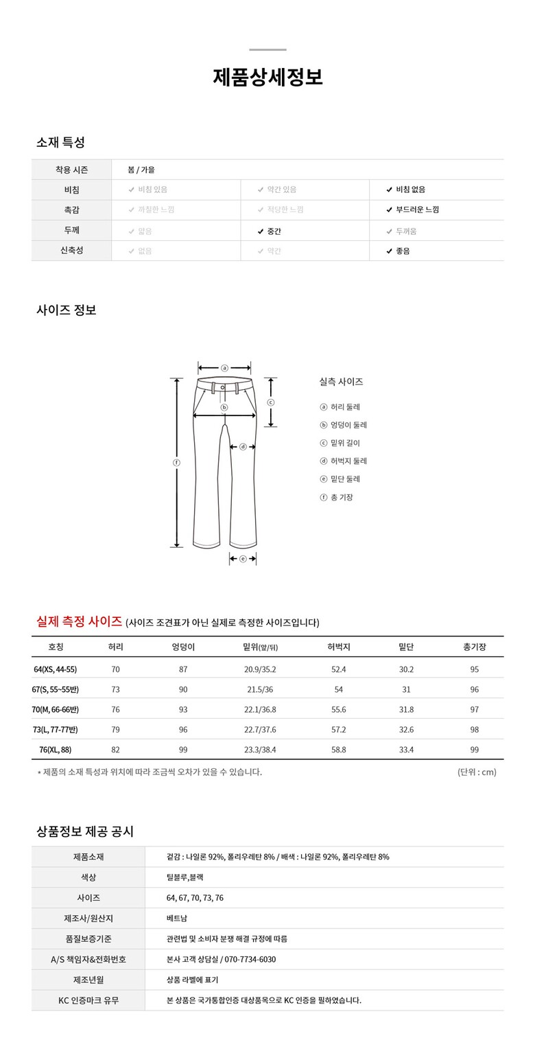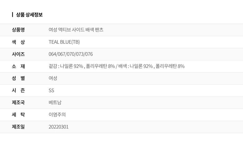 | 1. 제품 소재 (섬유의 조성 또는 혼용률을 백분율로 표시, 기능성인 경우 성적서 또는 허가서) | 겉감 : 나일론 92% , 폴리우레탄 8% / 배색 : 나일론 92% , 폴리우레탄 8% |