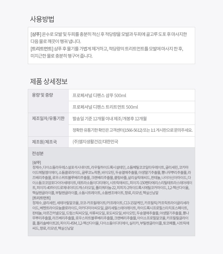 | 4. 사용방법 | 샴푸_온수로 모발 및 두피를 충분히 적신 후 적당량을 모발과 두피에 골고루 도포 후 마사지한 다음 물로 깨끗이 헹궈 냅니다.