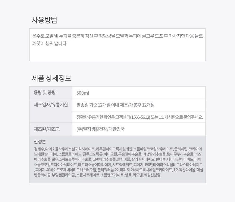 | 4. 사용방법 | 온수로 모발 및 두피를 충분히 적신 후 적당량을 모발과 두피에 골고루 도포 후 마사지한 다음 물로 깨끗이 헹궈 냅니다. |