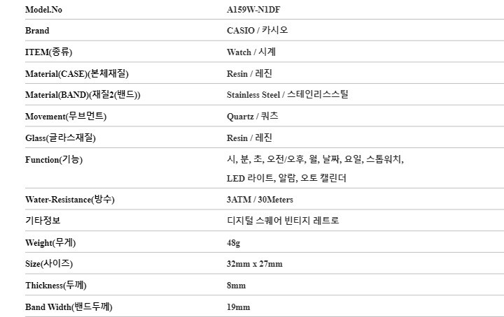 카시오 시계 A159W-N1DF (A159W-N1) 디지털 메탈시계 당일발송