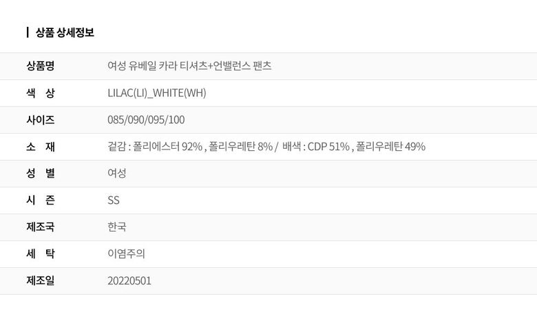 | 1. 제품 소재 (섬유의 조성 또는 혼용률을 백분율로 표시, 기능성인 경우 성적서 또는 허가서) | 겉감 : 폴리에스터 92% , 폴리우레탄 8% / 배색 : CDP 51% , 폴리우레탄 49% |