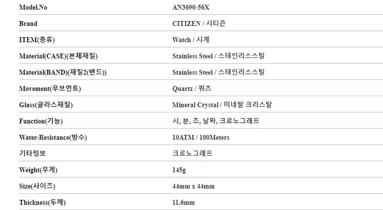 | 7. 주요 사양 | 스테인리스스틸 시계 쿼츠 |