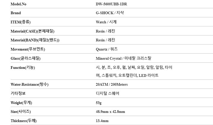 | 7. 주요 사양 | 레진 시계 쿼츠 |