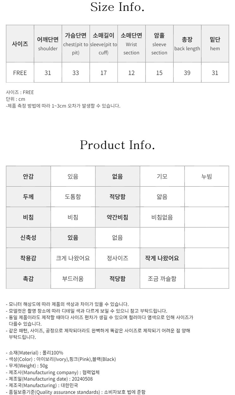 - COLOR(색상) : 아이보리(Ivory),핑크(Pink),블랙(Black)