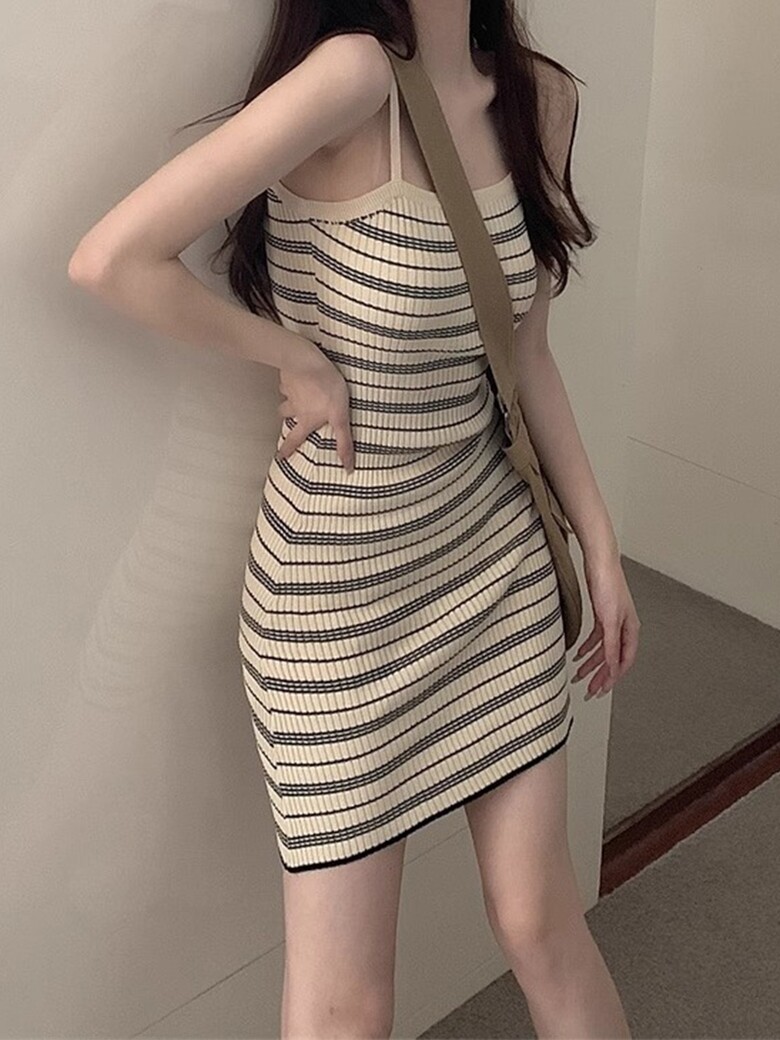 네쥬 여성 여름 골지 스트라이프 데일리 나시 미디 원피스