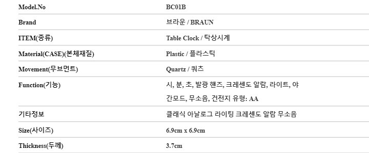| 7. 주요 사양 | 플라스틱 탁상시계 쿼츠 |