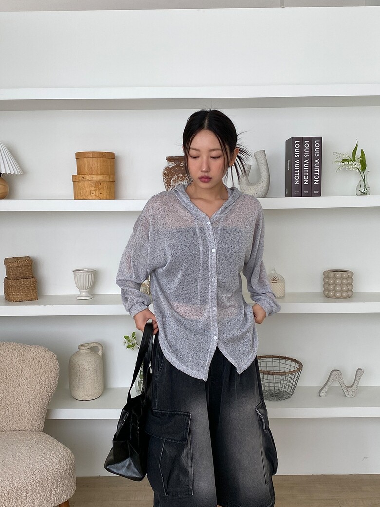네쥬 여성 여름 오버핏 시스루 얇은 긴팔 후드 니트 가디건