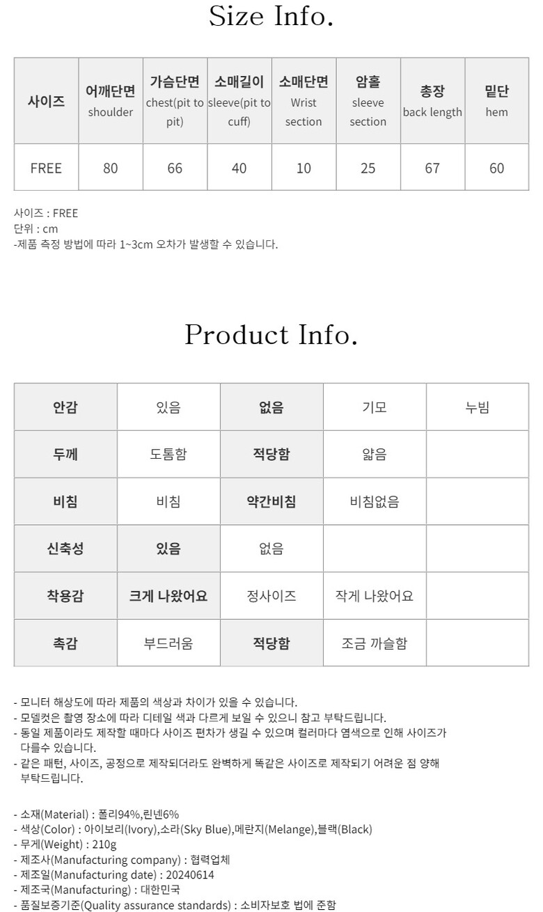 - COLOR(색상) : 아이보리(Ivory),소라(Sky Blue),메란지(Melange),블랙(Black)