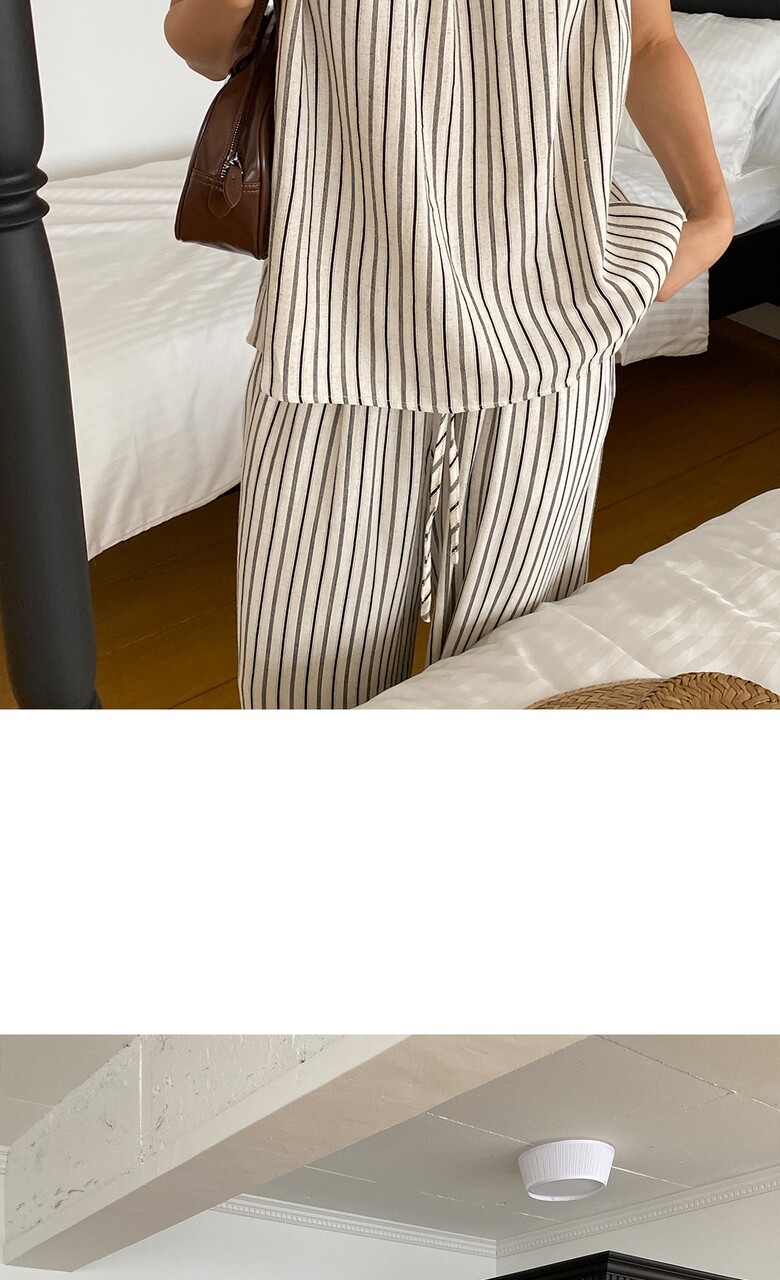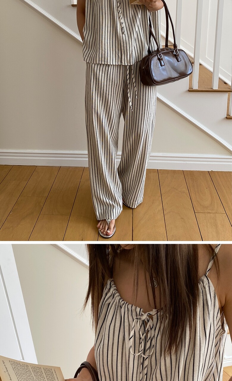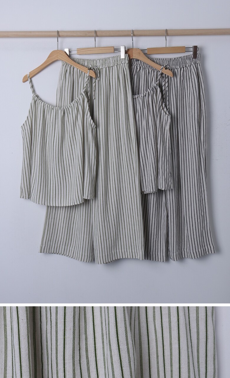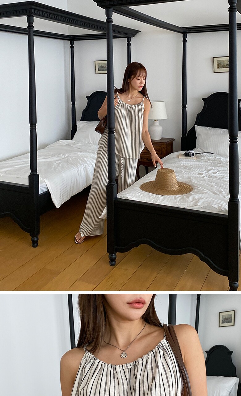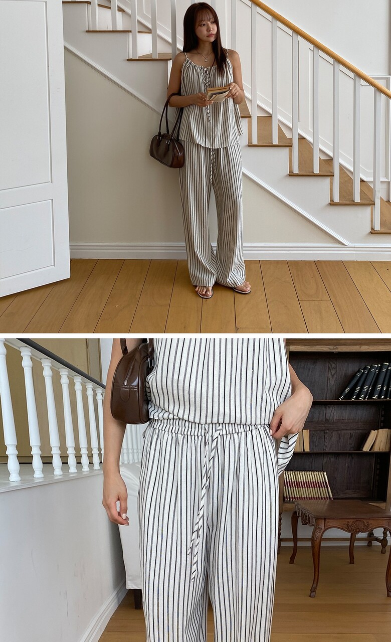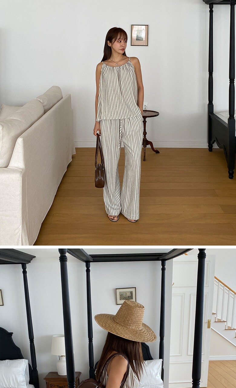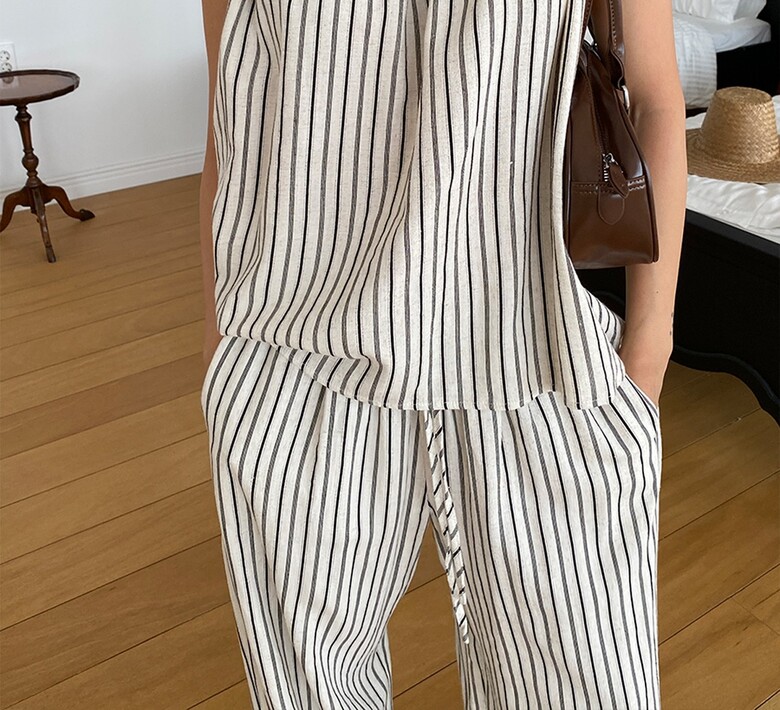 네쥬 여성 여름 린넨 스트라이프 나시 티셔츠 밴딩바지 세트