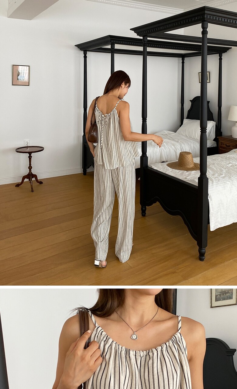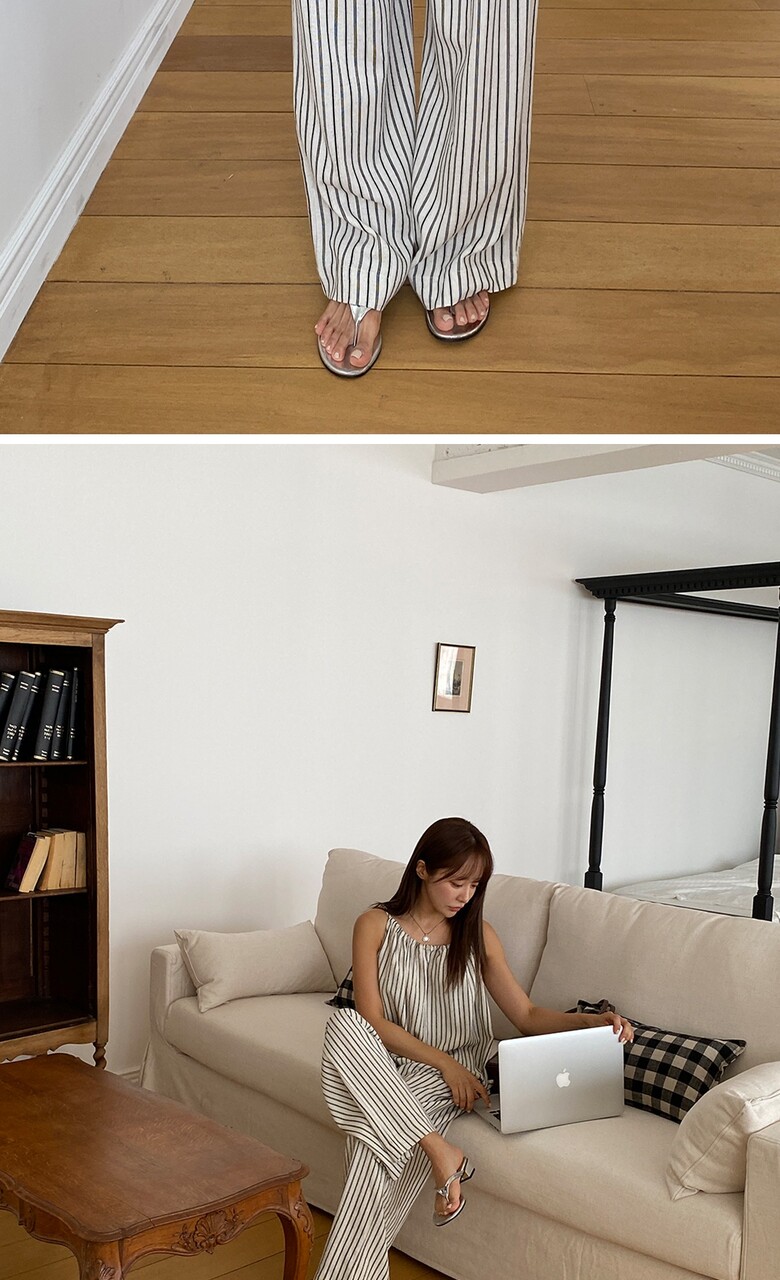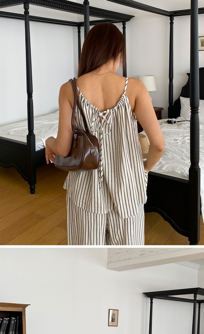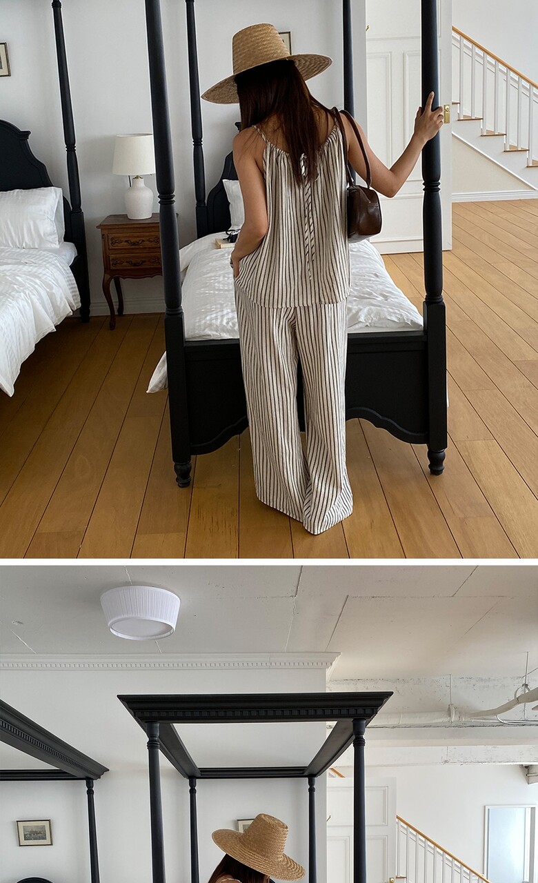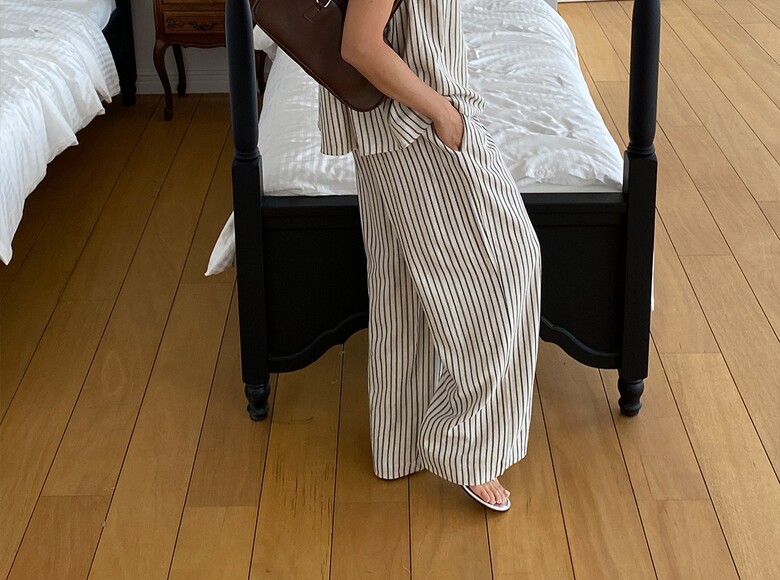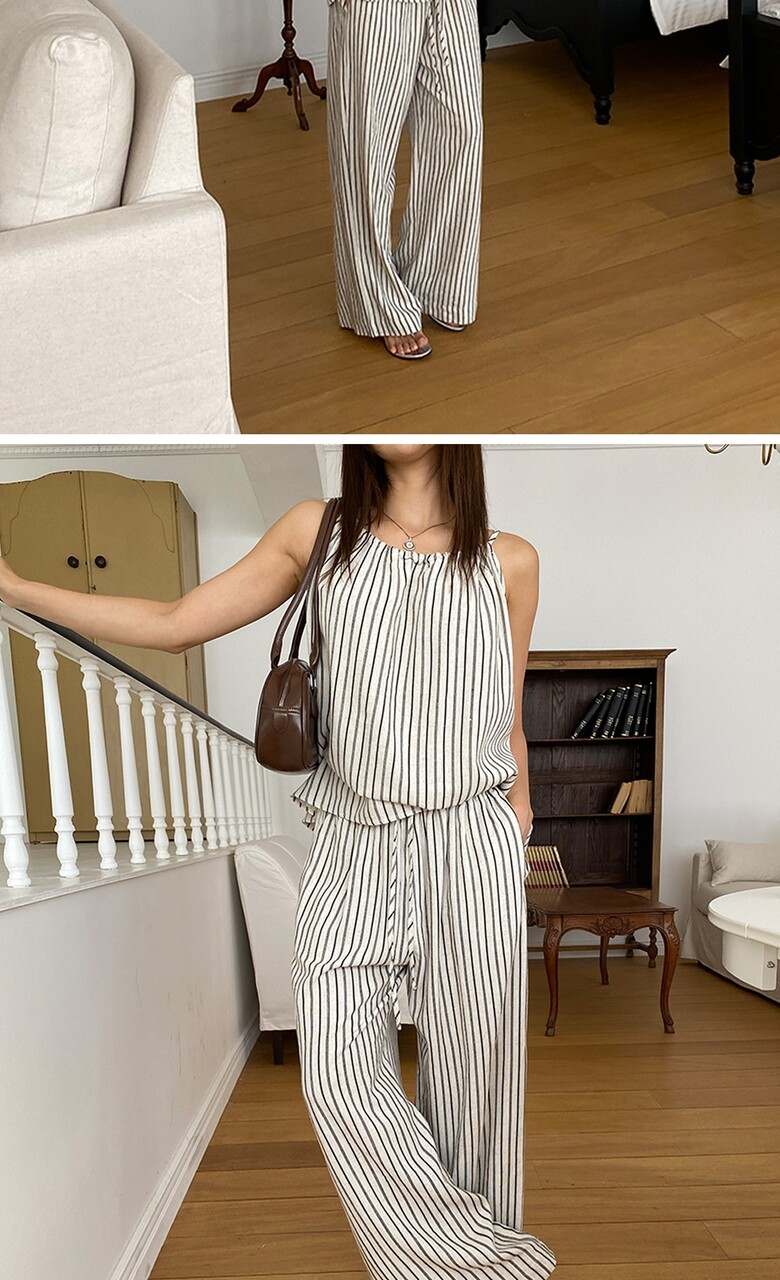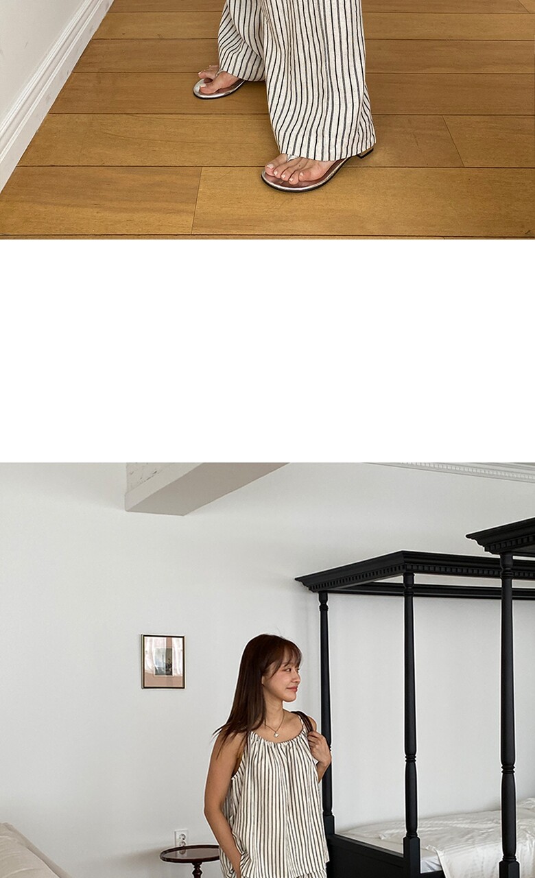 네쥬 여성 여름 린넨 스트라이프 나시 티셔츠 밴딩바지 세트