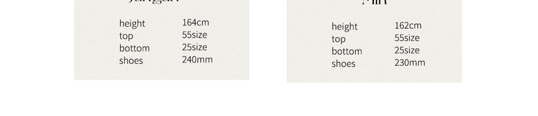Top 55 / Bust 75B / Pants 26 / Height 161cm / Shoes 230 size
