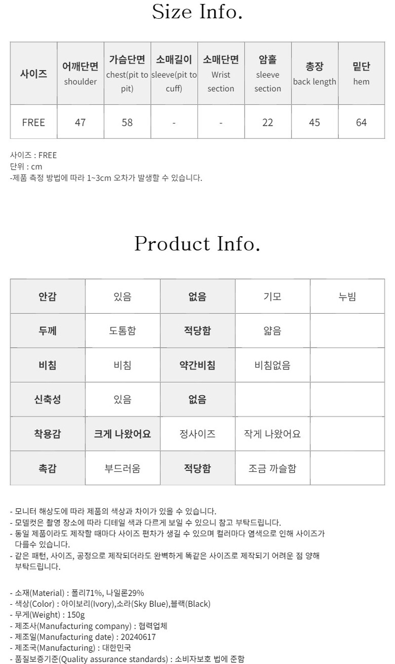 어깨단면 / 가슴단면 / 소매길이 / 소매단면 / 암홀 / 총장 / 밑단 (FREE)47 / 58 / - / - / 22 / 45 / 64