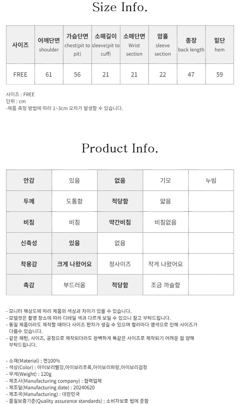 - 안감(없음),촉감(적당함),착용감(크게나옴),신축성(있음),두께감(적당함),비침(약간비침),사이즈(44~77)