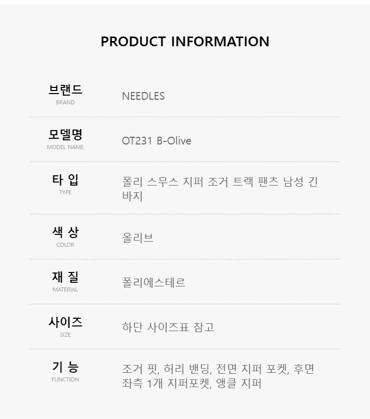 니들스 바지 OT231 B-Olive 지퍼 트랙 남성긴바지 당일발송