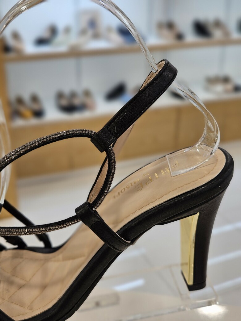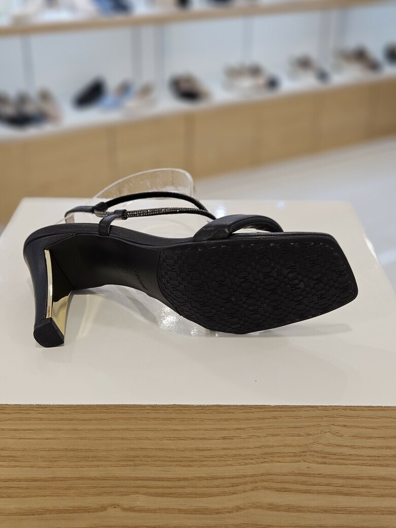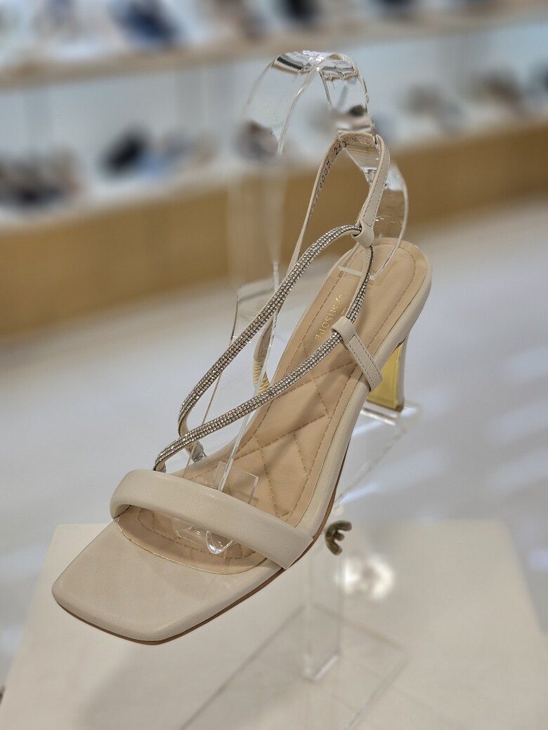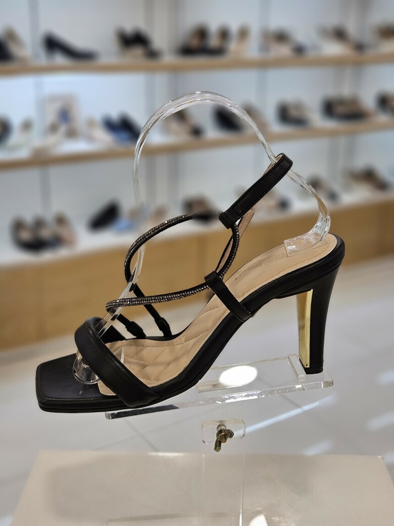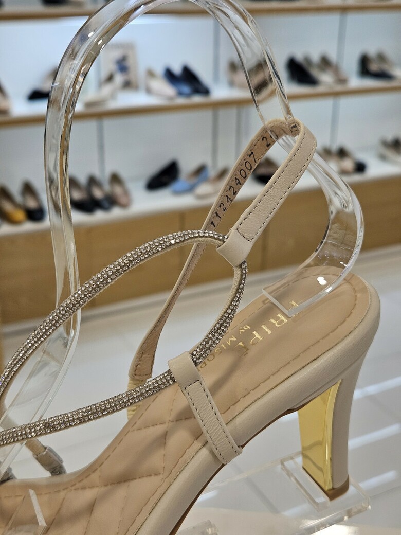 골드굽장식과 발등을 지나는 핫픽스 띠가 반짝거리는 포인트를 주는 제품