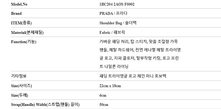 프라다 1BC204 2AOS F0002 리나일론 패딩 트라이앵글 로고 체인 미니 호보백 여성 숄더백