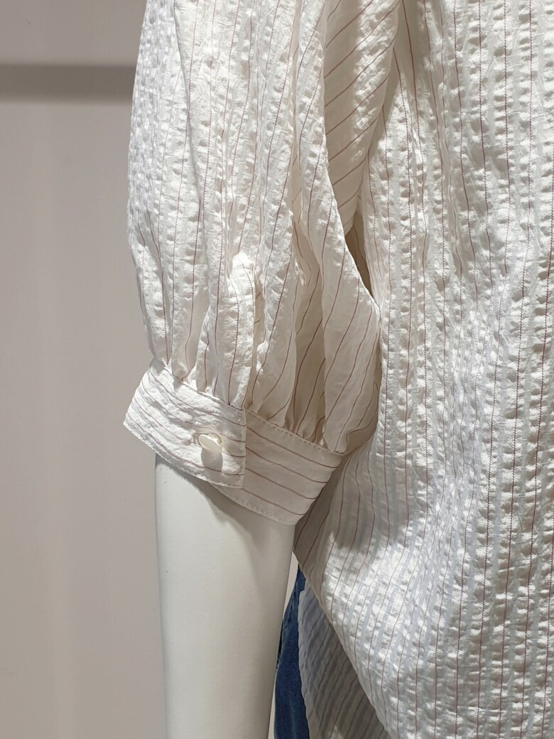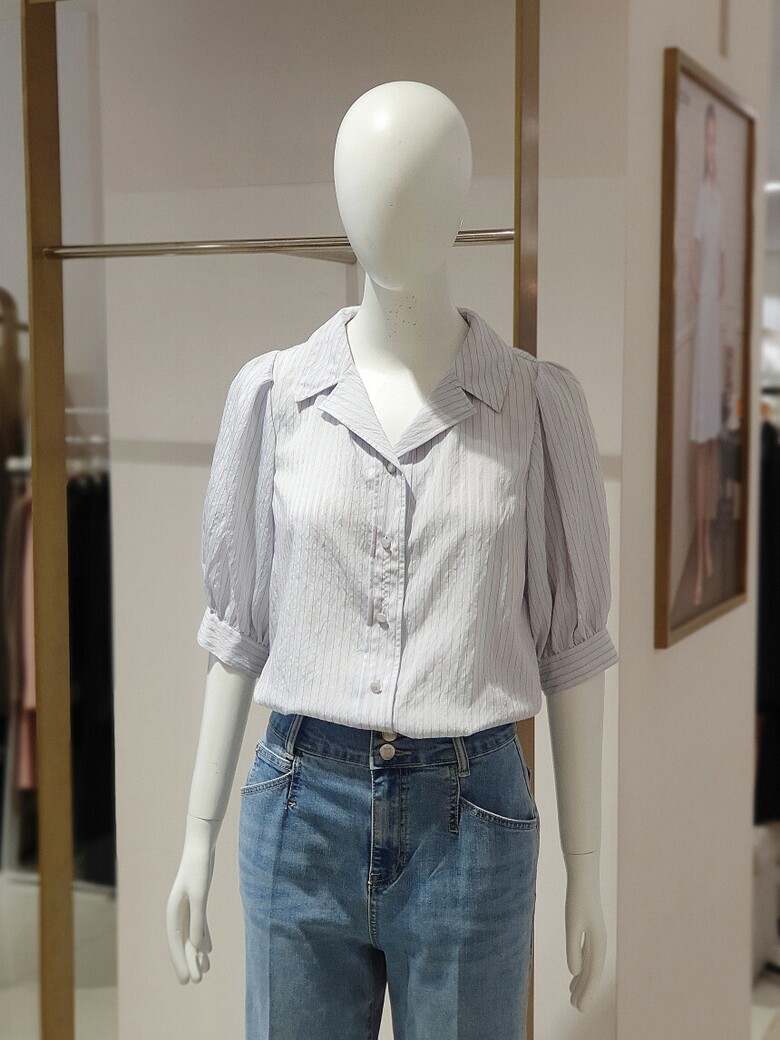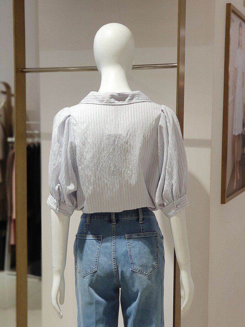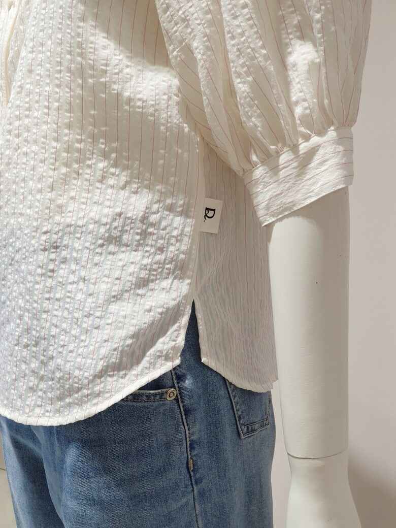 스트라이프 패턴에 볼륨 소매로 여성스러운 무드의
