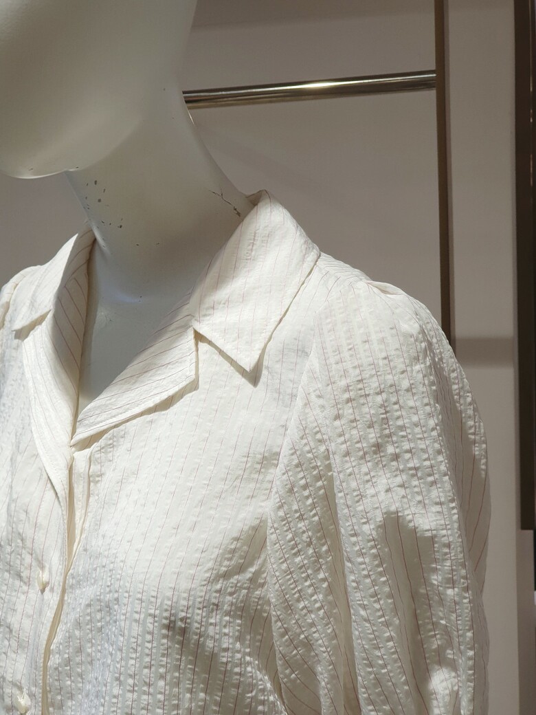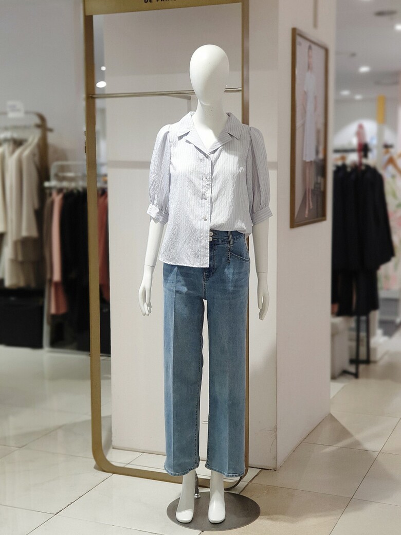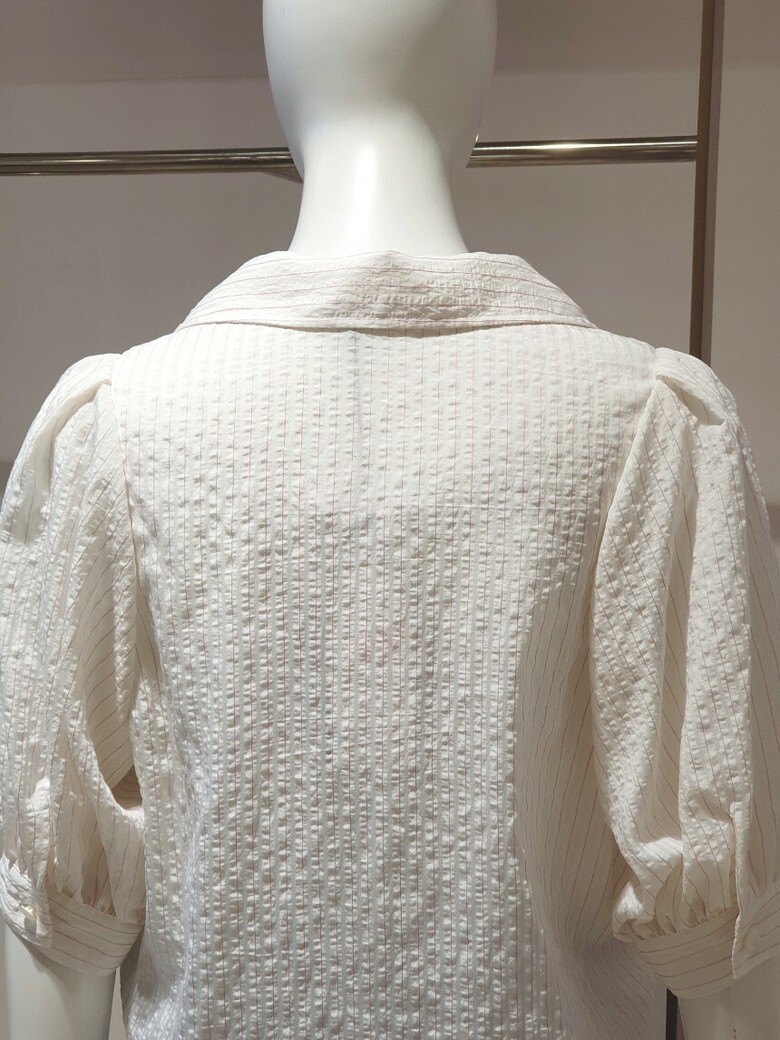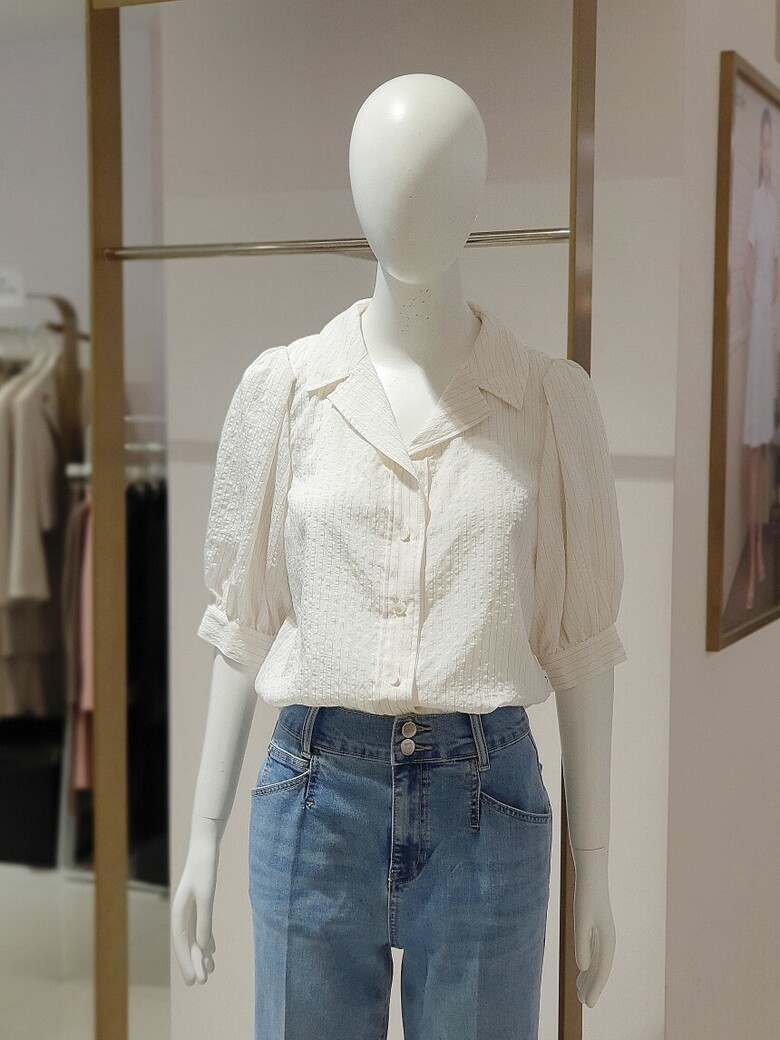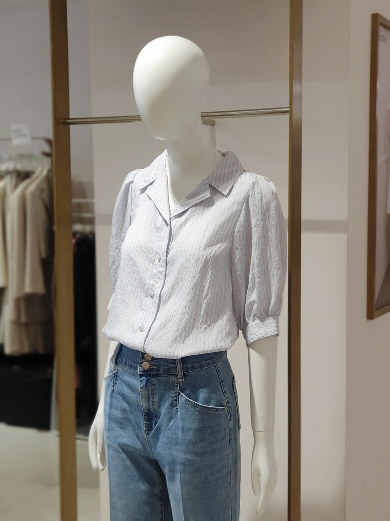 스트라이프 패턴에 볼륨 소매로 여성스러운 무드의
