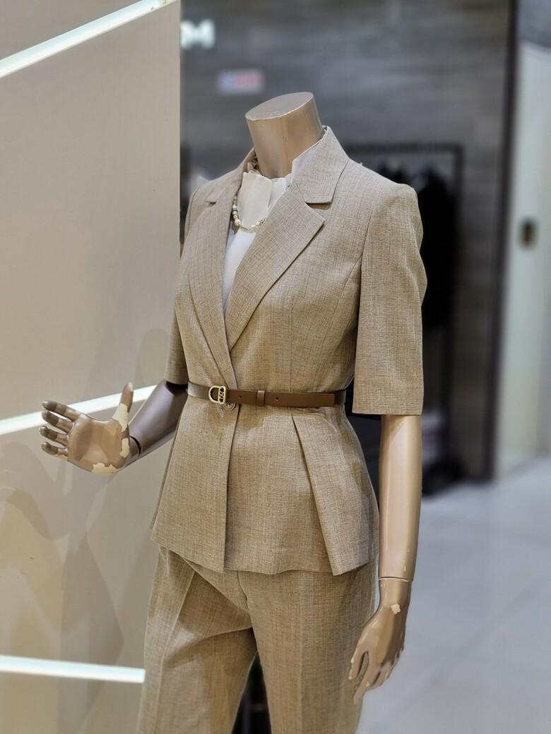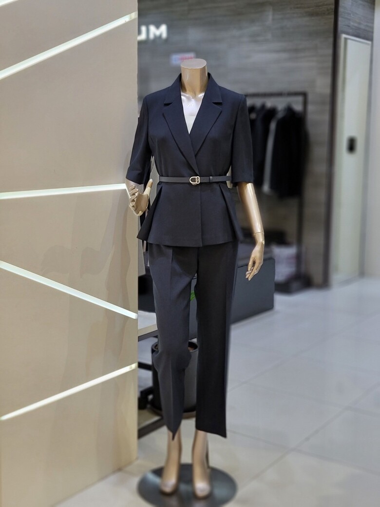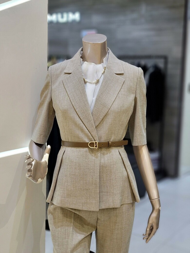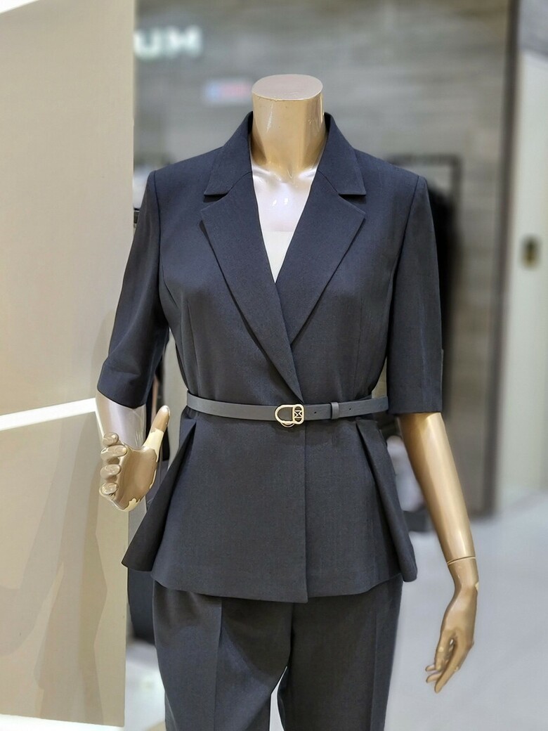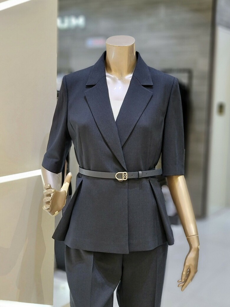 웨스트 핀턱 디테일로 페플럼 디자인이 연출되어