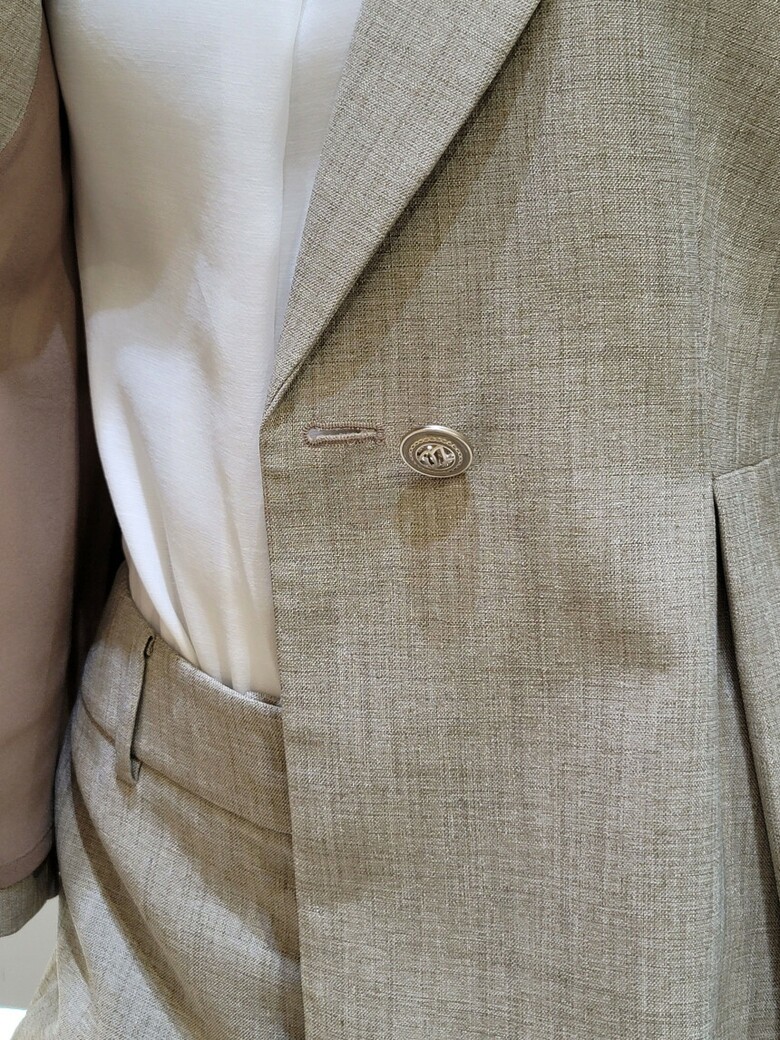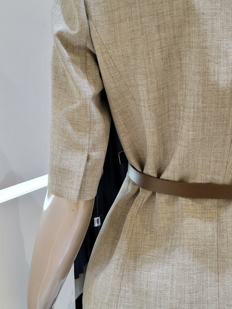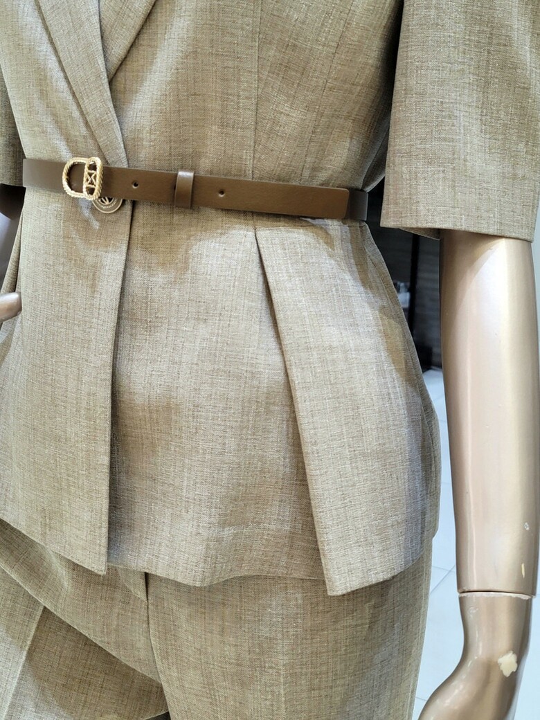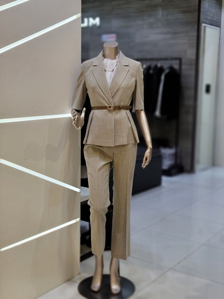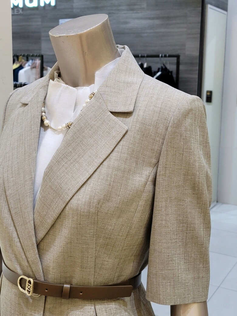 웨스트 핀턱 디테일로 페플럼 디자인이 연출되어